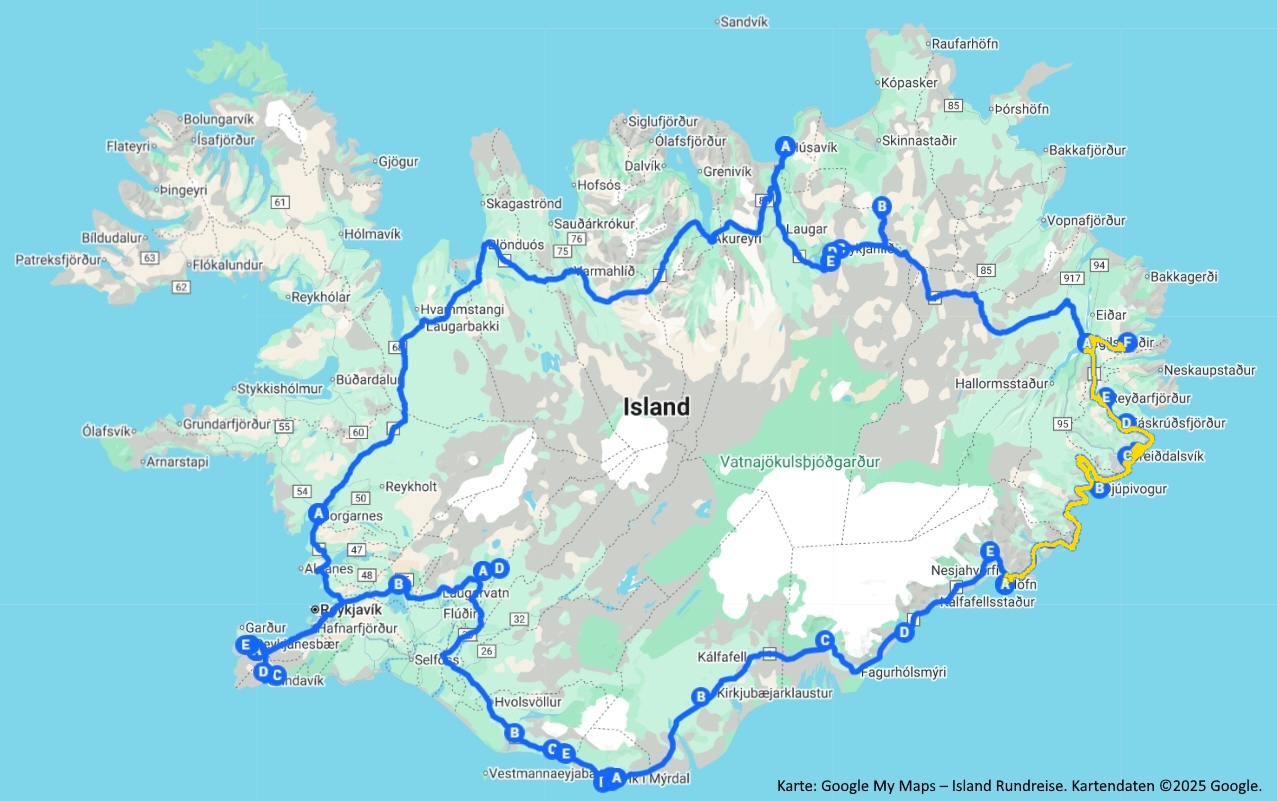 Insgesamt sind wir an diesem Tag ca. 320 km gefahren. Wir sind von Höfn die Küste entlang, durch kleine Orte wie Djúpivogur und Breiðdalsvík. Nichts Großes, kein großes Programm – genau richtig. Wenig Verkehr, viel Landschaft, Meer rechts, Berge links. Das tat gut.